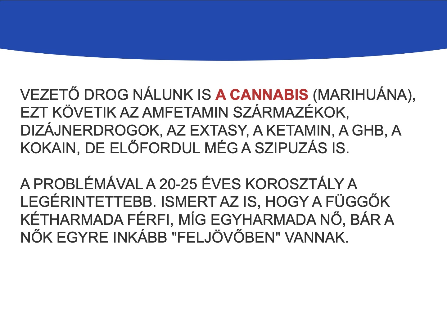 Drogfüggőségről akkor beszélhetünk, ha valaki állandó sóvárgást érez egy adott szer után, a szer használatát nem tudja kontrollálni, mert a drog elhagyása testi és lelki, úgynevezett elvonási tüneteket okoz nála.